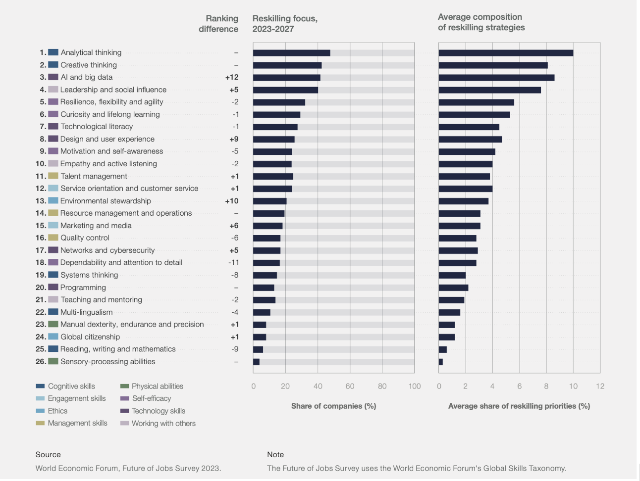 Nel Rapporto 2023 sul Futuro del Lavoro, il World Economic Forum ha individuato le 10 competenze future più rilevanti. Mentre 3 competenze su 10 riguardano skills tecnologiche, dominano i primi 10 posti della classifica competenze cognitive, di autoefficacia e di relazione con gli altri: tutte abilità della sfera personale (soft skills).